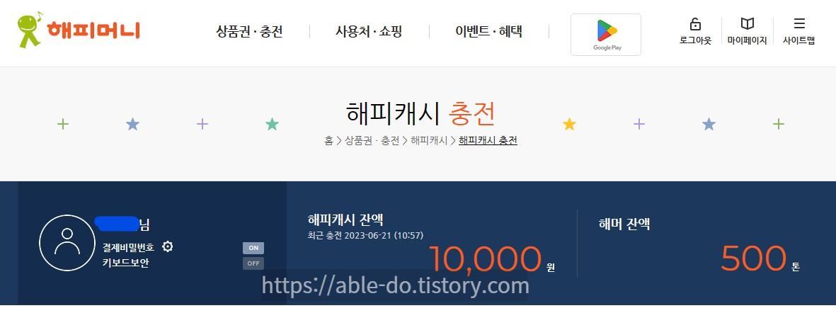 1. 해피머니 사이트에 로그인한 뒤 해피머니 충전하기